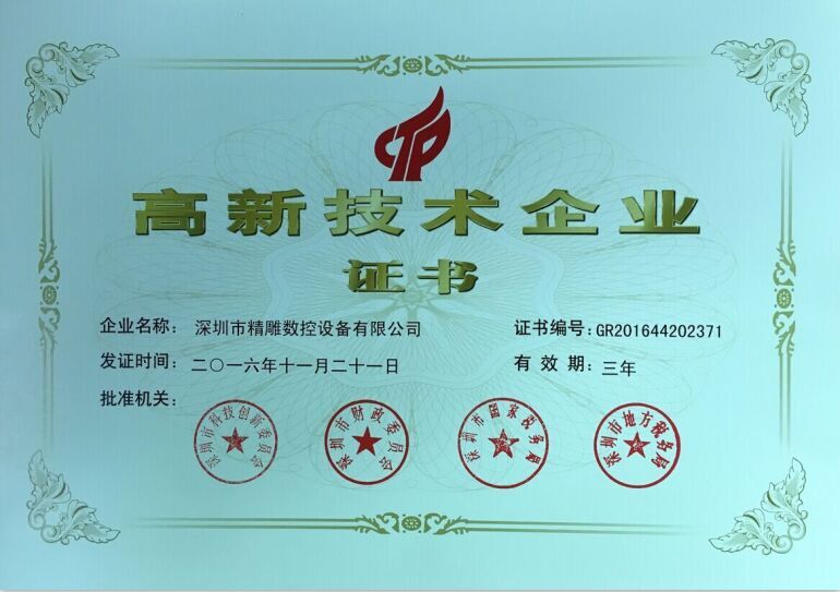 深圳市精雕數控設備有限公司2017年正式拿到國家國高企業認定證書。