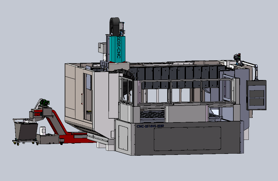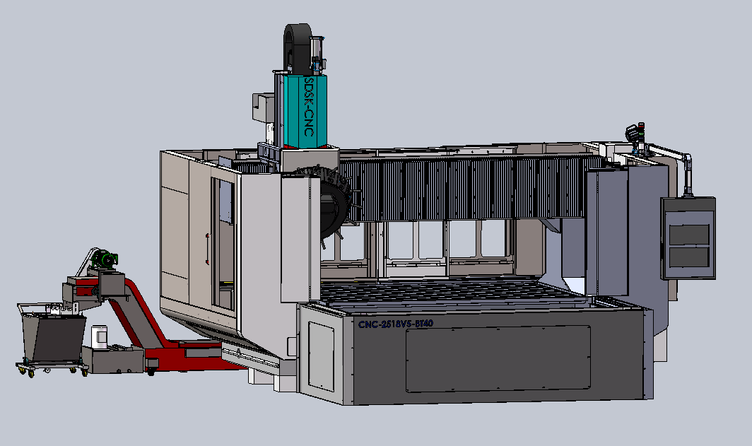 1、SDSK2518V5-BT40機(jī)型是專門為客戶量身定做的輕型2.5米龍門加工中心;定梁式結(jié)構(gòu);配有臺(tái)灣圣杰16位飛碟式刀庫,換刀速度為2秒;運(yùn)動(dòng)方式為Y軸工作臺(tái)前后移動(dòng),X軸左右移動(dòng),Z軸上下移動(dòng)。
